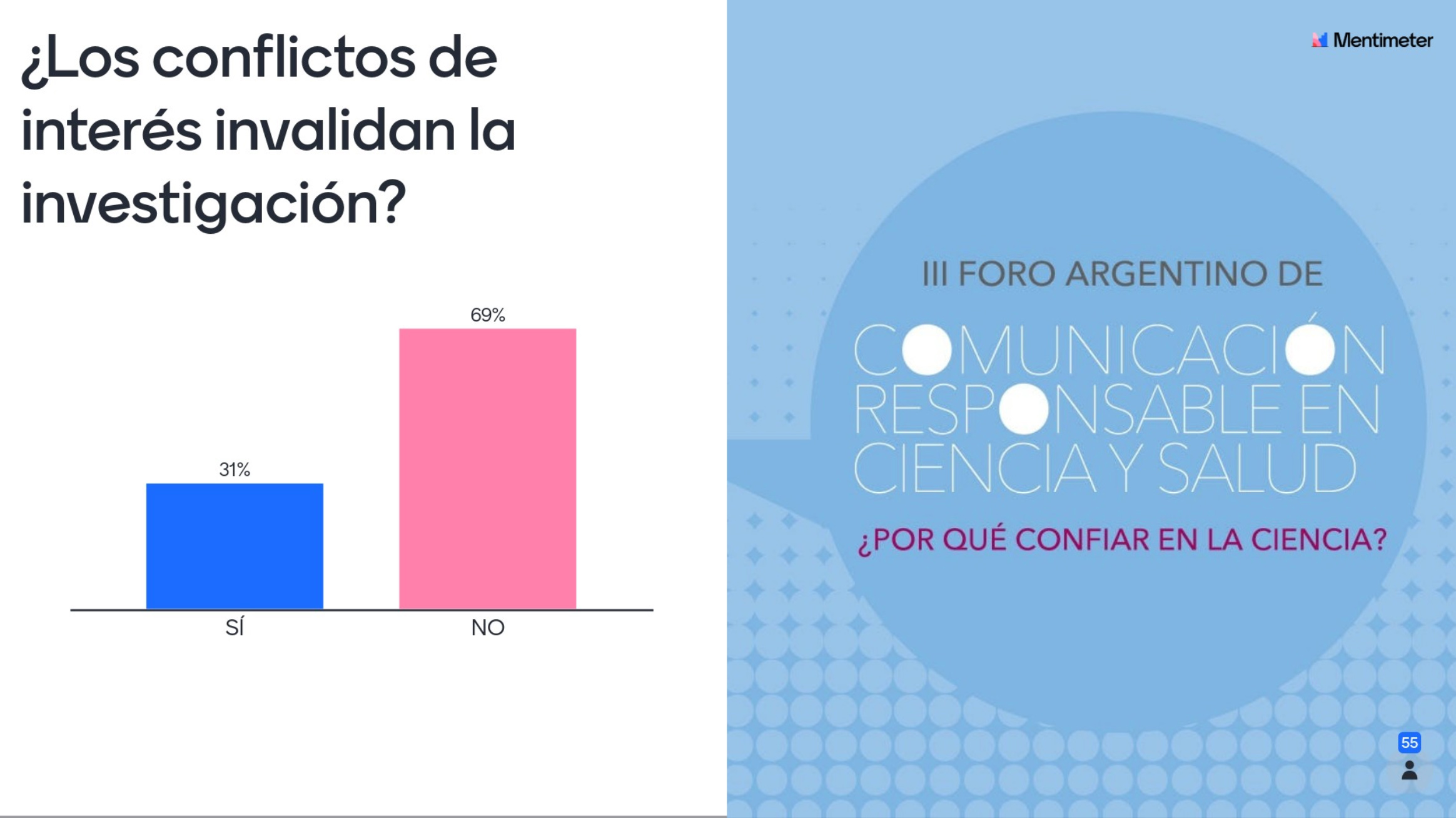 - La siguiente pregunta era ¿Los conflictos de interés invalidan una investigación? 31% respondió que sí y 69% que no.