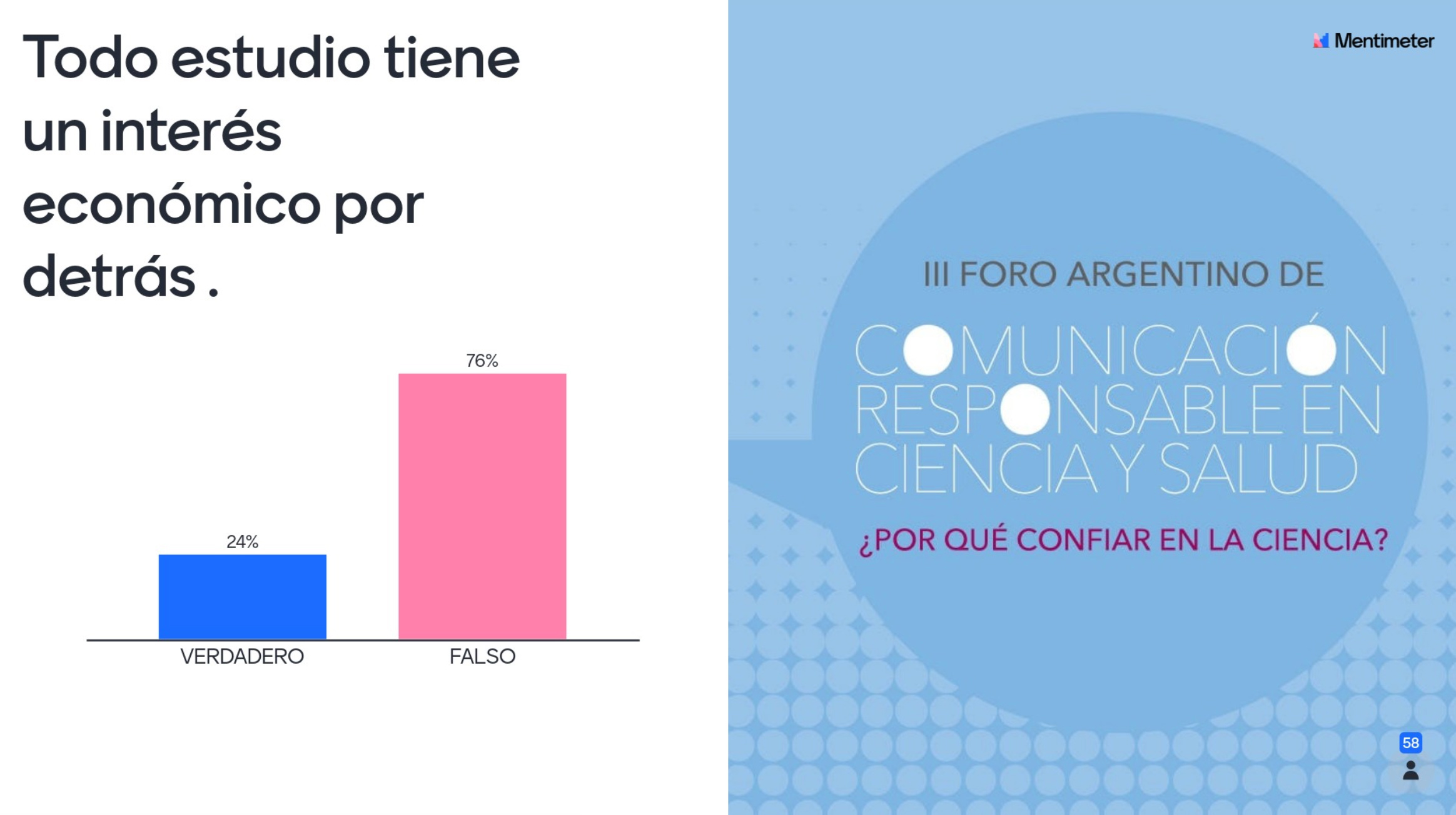- Las siguientes opciones eran por verdadero falso. 86% de las personas que respondieron dijo que es verdadero que “Los medios de comunicación no reflejan la realidad de las investigaciones” y 14% opinó que esta afirmación es falsa. Con respecto a la afirmación “Todo estudio tiene un interés económico por detrás”, un 24% respondió que es verdadero y un 76% que es falso.